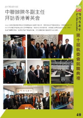 2017年3月10日 中聯辦陳冬副主任 拜訪香港菁英會 中央人民政府駐港香港特別行政區聯絡辦公室陳冬副主任、陳林部長及李薊貽副部長一眾領導於2017年 3月10日參觀青年廣場並與各青年團體會面,期間拜訪香港菁英會,與全體主席團成員進行交流。其後, 各青年團體更舉辦「香港各界青年領袖座談會」與代表團成員討論香港未來的發展。 第 十 屆 執 委 會 就 職 典 禮 40