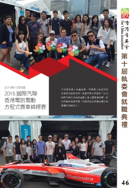 第 十 屆 執 委 2016年10月8日 香港菁英會主席盧金榮、常務副主席莊家彬 2016 國際汽聯 及理事何超蓮帶同一班學界菁英同學到「2016 會 香港電訊電動 國際汽聯香港電訊電動方程式賽車錦標賽」的 就 內部維修通道參觀,同學更能近距離接觸比賽 方程式賽車錦標賽 車輛及拍攝留念。 職 典 禮 46